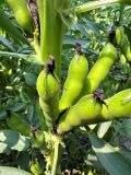 Faba beans are at R5 (full pod) with pods developing on the upper nodes and full seeds at the lower nodes.