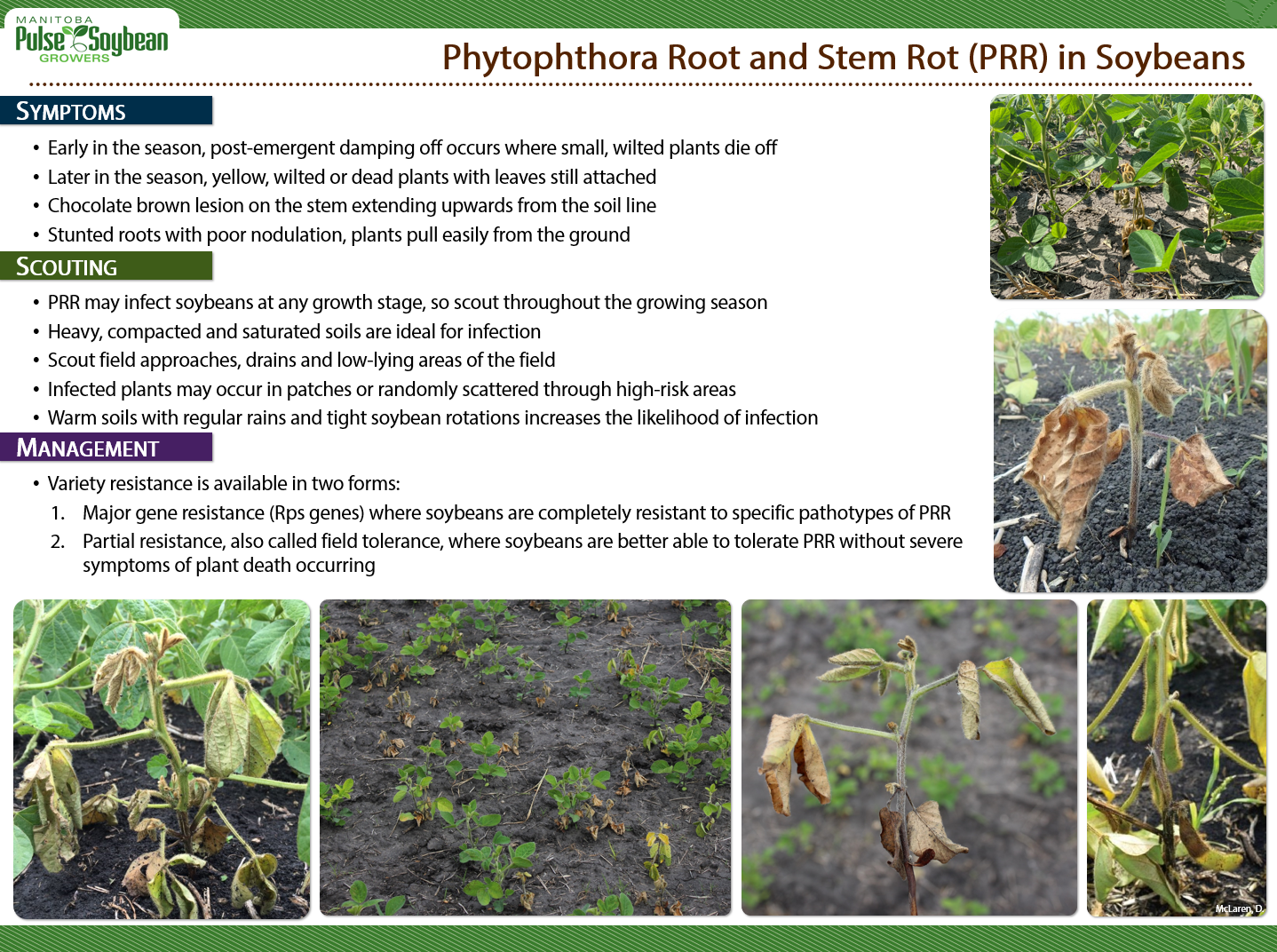 - Major gene or pathotype-specific resistance: an Rps (Resistance Phytophthora sojae) gene is completely resistant to specific pathotypes of PRR in the field’s soil. Multiple pathotypes of PRR can occur in a field, so knowing which are present in the soil is crucial to use this variety resistance.