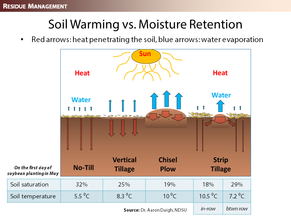 The minimum soil temperature for dry bean germination is 12 ⁰C, while soil temperatures greater than 15 ⁰C will result in faster emergence. Dry beans also require sufficient moisture to germinate. With any residue management strategy, there is a trade-off between soil warming and moisture retention. See the example from Aaron Daigh, NDSU below of four residue management strategies tested on-farm in advance of soybean planting.