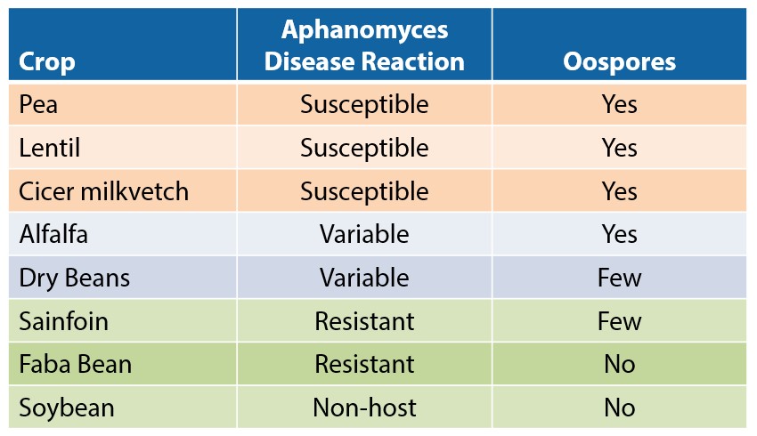 Dry bean susceptibility to Aphanomyces root rot varies with variety and market class. As a result, dry beans are not considered a break crop like soybeans of faba beans.When dry beans are infected with Aphanomyces, research indicates that few oospores are produced.