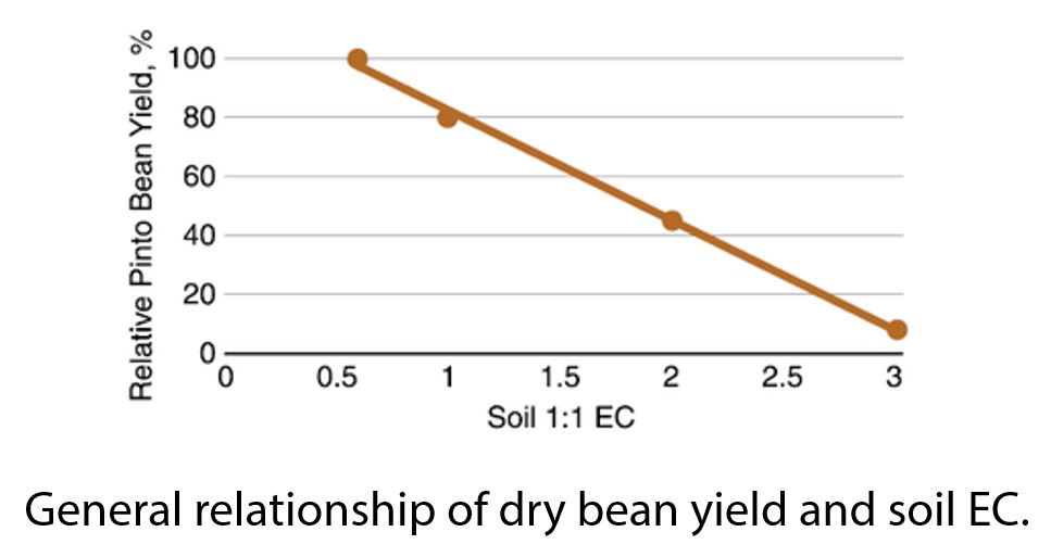 Saline soils are measured using a soil EC test (a dS/m is equivalent to a mmho/cm). Saline soils are those that have an EC value greater than 2.0 mmho/cm. The salinity threshold past which dry beans start to see yield loss is low (0.5 mmho/cm). Dry bean are less tolerant to salinity than soybeans and faba beans. For each increase of 0.5, there is an approximate decrease in yield potential of 20%.