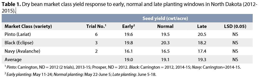 Recent planting date research in North Dakota has shown that typical late May to early June planting dates for all dry bean market classes remain appropriate for optimum yield potential and reduced frost risk. From 2012 to 2015, pinto, black and navy bean beans yielded similarly between early (May 11-24), normal (May 22-June 5) and late (June 5-18) planting dates (Table 1). A trend toward higher yields for normal and late planting dates was observed, although this was not significant.