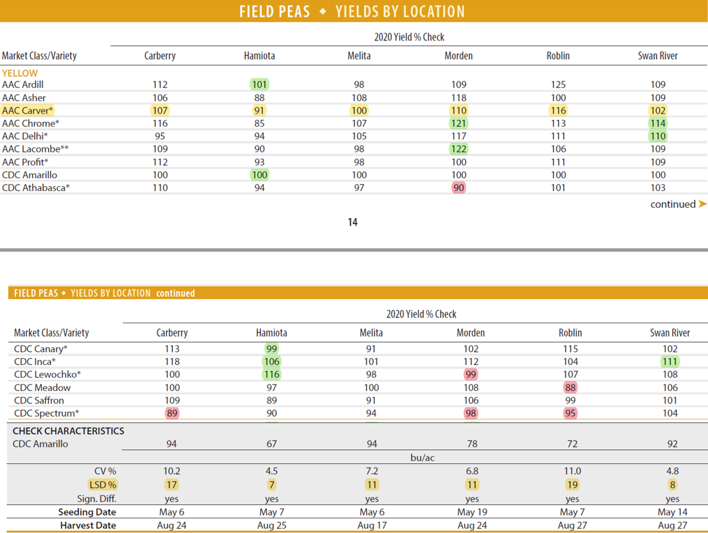 - The example below uses AAC Carver as the chosen variety (highlighted in yellow) for yellow peas. Values highlighted in green yielded significantly more at that site-year, while those highlighted in red yielded poorer. No highlight means no difference.