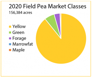 Yellow peas are typically destined for human consumption, protein extraction and fractionation. They don’t bleach in the field so they can handle delayed harvest and later desiccation timing (to reduce greens). Yellow peas are widely purchased by grain buyers, while other classes are more specialized.