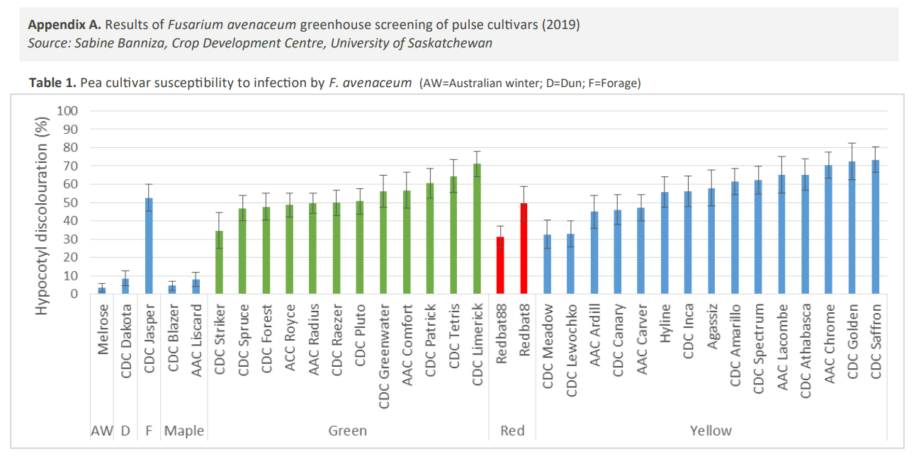 - CDC Meadow, CDC Lewochko, AAC Ardill, CDC Canary and AAC Carver are yellow pea varieties identified with improved resistance to F. avenaceum.