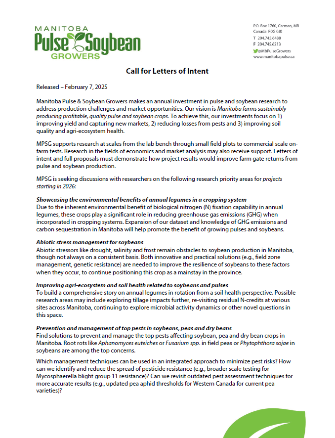 Manitoba Pulse & Soybean Growers makes an annual investment in pulse and soybean research to address production challenges and market opportunities. Our vision is Manitoba farms sustainably producing profitable, quality pulse and soybean crops. To achieve this, we prioritize investment into scientific research that aims to ensure profitability for farmers, answer relevant production questions, discover new opportunities and increase the long-term sustainability of the pulse and soybean industry in Manitoba.